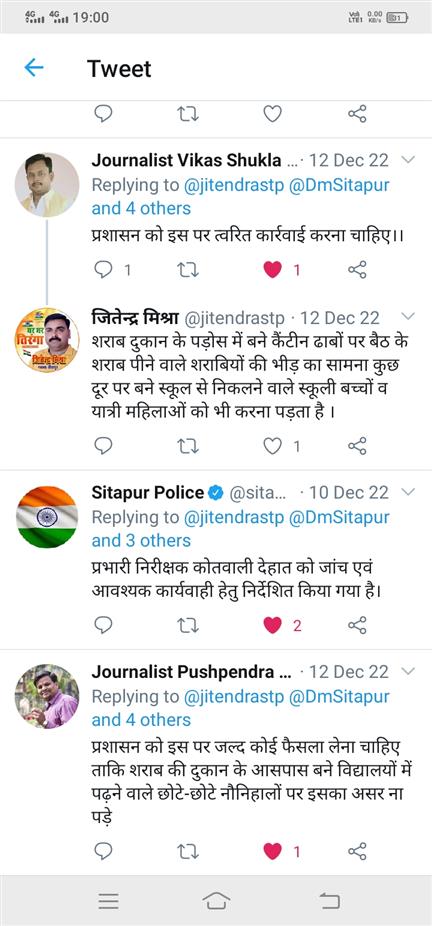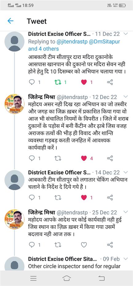 इस लेख के साथ कुछ माह पहले हमने एक ख़बर लिखी जो सत्य भी और टि्वटर पर उस ख़बर को डालने के बाद उत्तरप्रदेश आबकारी विभाग के द्वारा ये कमेंट किया गया कि जिला सीतापुर में छापा मारे ज रहे आदेशित किया गया है लेकिन ज़िला सीतापुर के आबकारी विभाग के द्वारा उस लोकेशन पर जहाँ की ख़बर लिखी गई आज तक जस का तस हाल है उस ख़बर की तस्वीर ट्विटर कमेंट साझा कर रहा हूँ।